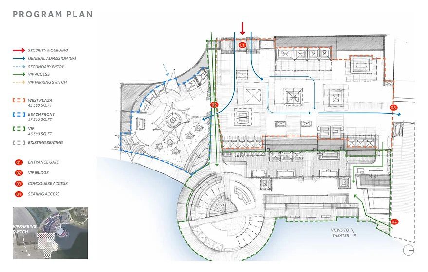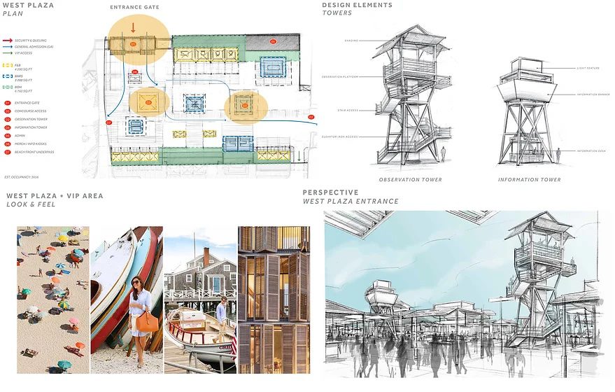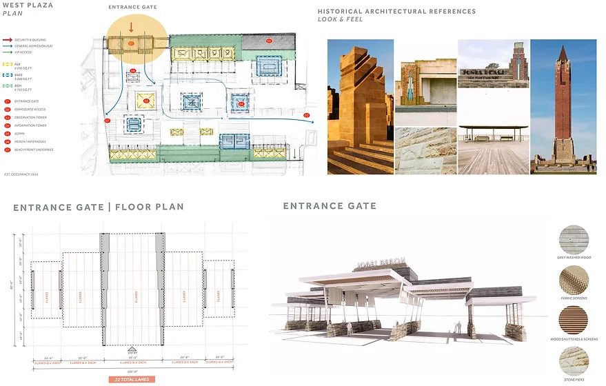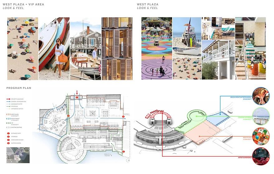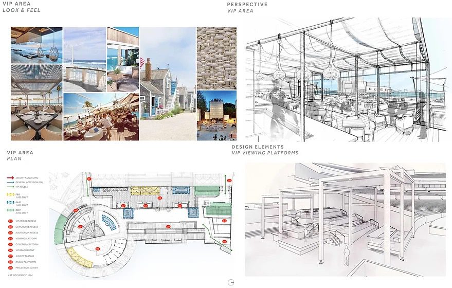 Jones Beach Theater concept design was inspired by relaxed vibe from coastal living, bitchy, with a twist of Art Deco. Engaging, fun and modular concept that helps easier navigate through out: way finding, large screens and color changing light effects amplifies the excitement of the shows, beacon towers for observations and photo ups were also introduced to this new theatrical experience.